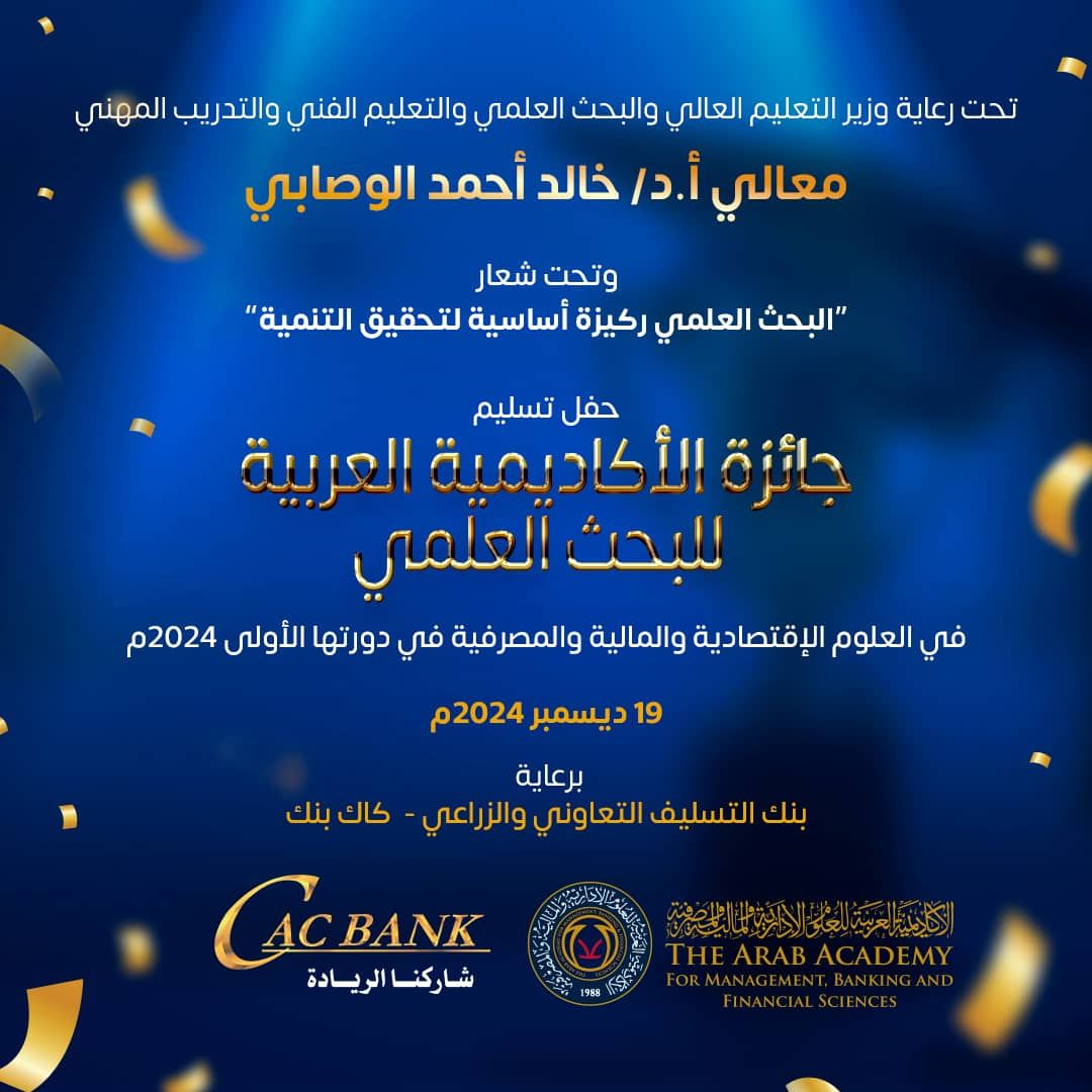 اللجنة الإشرافية لجائزة الأكاديمية العربية للبحث العلمي في العلوم الاقتصادية والمالية والمصرفية تقر نتائج تحكيم البحوث المتقدمة للمنافسة وتحدد يوم الخميس الموافق 19 ديسمبر ٢٠٢٤م الساعة العاشرة صباحاً للاحتفال بالفائزين وتكريمهم وذلك في قاعة البتراء – فندق كورال عدن.