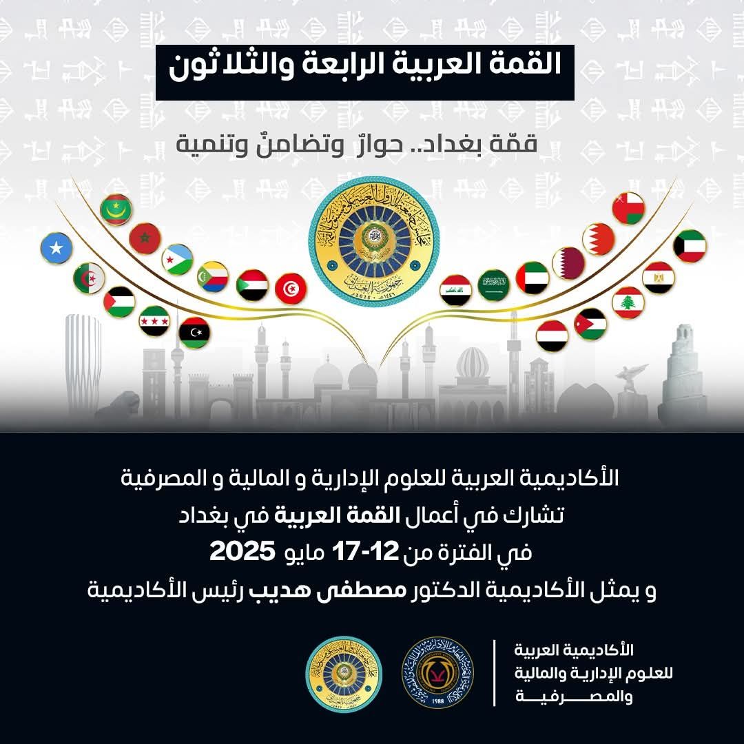 تشارك الأكاديمية العربية للعلوم الإدارية والمالية والمصرفية في القمة العربية التي تُعقد في بغداد خلال الفترة من 12 إلى 17 مايو 2025، ويمثلها في القمة الدكتور مصطفى هديب، رئيس الأكاديمية.